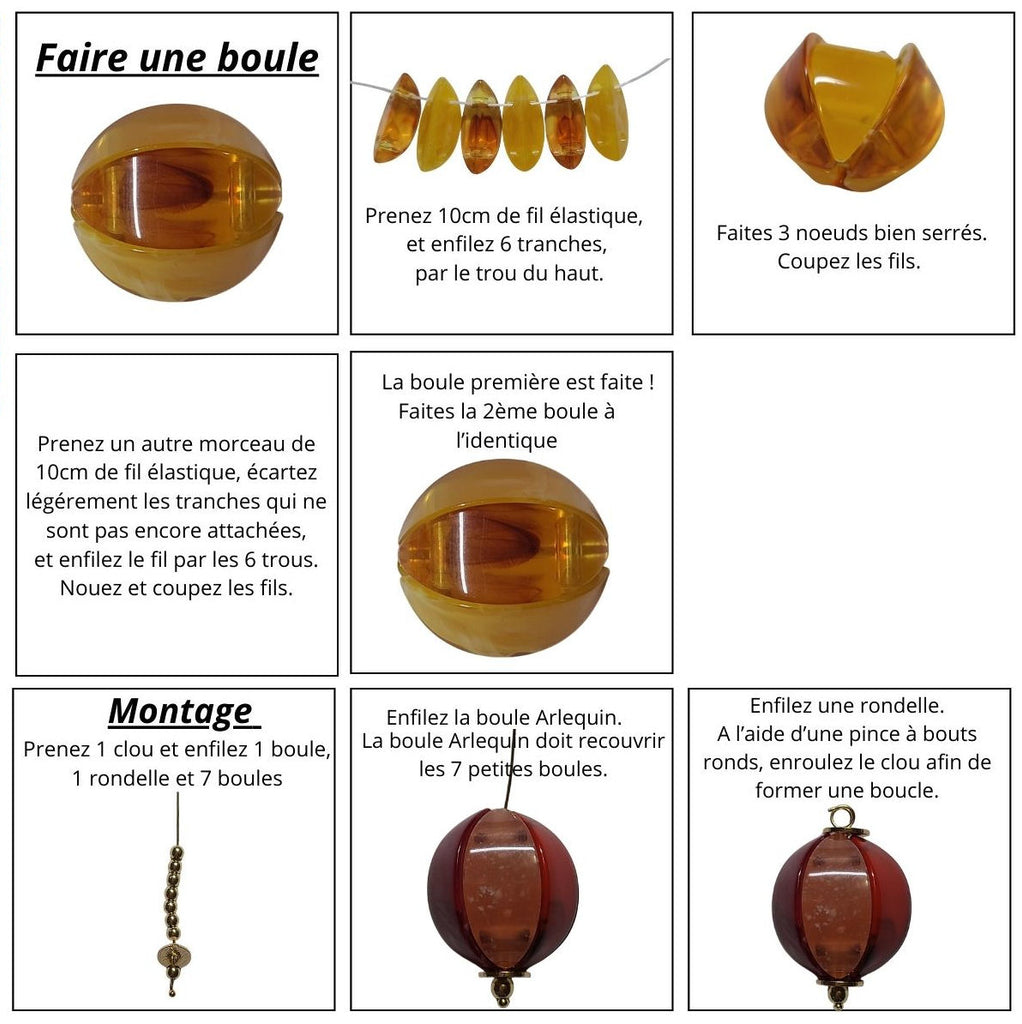 Fournitures: 12 tranches Clémentis - 20cm de fil élastique - 2 clous - 4 rondelles 8MM - 16 boules de 3MM - 1 paire de créoles